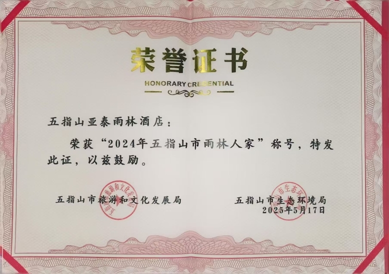 荣获由五指山市旅游和文化发展局五指山市生态环境局联合颁发的 “2024年五指山市雨林人家” 称号!