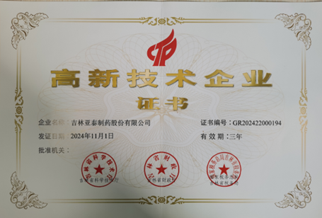 热烈庆祝亚泰制药通过2024年度高新技术企业认定工作