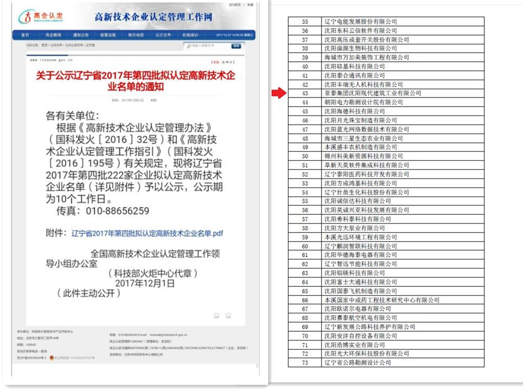 根据《高新技术企业认定管理办法》和《高新技术企业认定管理工作指引》的相关规定,亚泰集团沈阳现代建筑工业有限公司被认定为高新技术企业,全国高新技术企业认定管理工作领导小组办公室于2017年12月1日已公示认定通知,目前已下发《高新技术企业证书》的编号(GR201721000903)。
